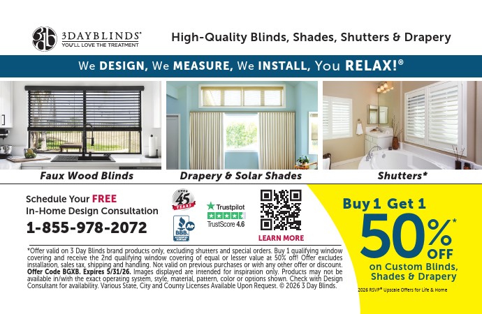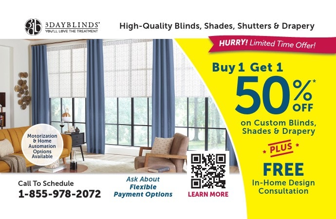 Buy 1 Get 50% Off on Custom Blinds, Shades & Drapery!