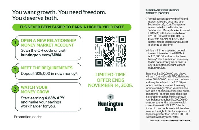 Open a new relationship money market account, deposit $25,000 in new money; start earning 4.23% APY with this RSVP Card! Offer expires 11/14/2025