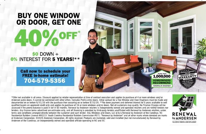 Buy One Window Or Door, Get One 40% Off - $0 Down + 0% Interest For 5 Years!