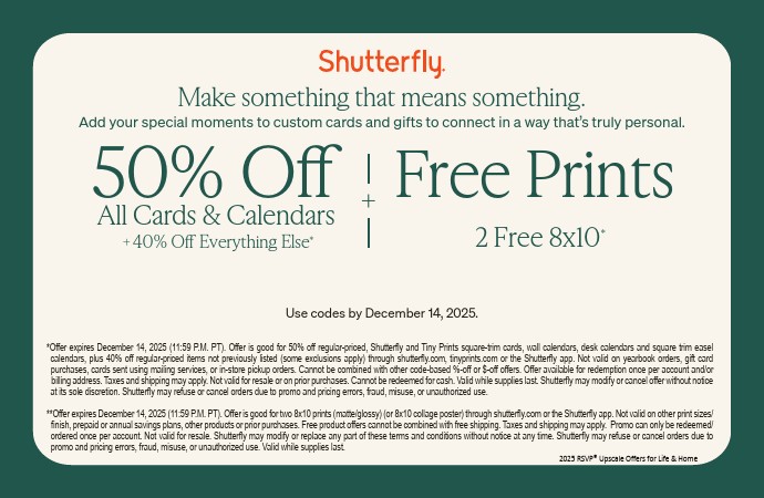 50% Off All Cards & Calendars + 40% Off Everything Else + 2 8x10 Prints!