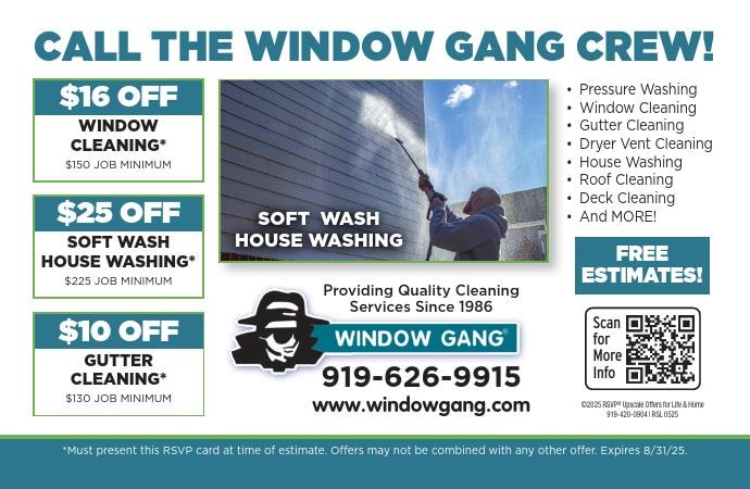 $16 off Window Cleaning; $25 off Soft-Wash House Washing; $10 off Gutter Cleaning with this RSVP Card!